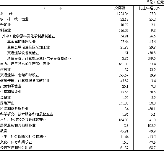 在城鎮(zhèn)固定資產(chǎn)投資中,國(guó)有及國(guó)有控股單位投資1306.87億元,比上年增長(zhǎng)25.4%。第一產(chǎn)業(yè)投資32.13億元,增長(zhǎng)25.2%;第二產(chǎn)業(yè)投資749.32億元,增長(zhǎng)23.7%;第三產(chǎn)業(yè)投資1142.61億元,增長(zhǎng)29.3%。 重點(diǎn)行業(yè)和重大項(xiàng)目投資帶動(dòng)作用明顯。全省電力工業(yè)投資446.09億元,增長(zhǎng)38.3%;公路建設(shè)投資345.67億元,增長(zhǎng)17.7%,水利環(huán)境和公共設(shè)施管理164.03億元,增長(zhǎng)41.0%。