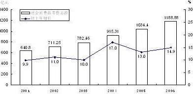 2001-2006年社會(huì)消費(fèi)品零售總額及其增長(zhǎng)速度