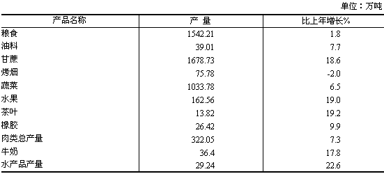 ,比上年增長(zhǎng)1.8%,實(shí)現(xiàn)了從2003年以來(lái)連續(xù)4年增產(chǎn)的可喜成就。油料產(chǎn)量39.01萬(wàn)噸,增長(zhǎng)7.7%;烤煙產(chǎn)量75.78萬(wàn)噸,下降2.0%;蔬菜產(chǎn)量1033.78萬(wàn)噸,增長(zhǎng)6.5%;水果產(chǎn)量162.56萬(wàn)噸,增長(zhǎng)19.0%;茶葉產(chǎn)量13.82萬(wàn)噸,增長(zhǎng)19.2%;鮮切花產(chǎn)量39.9億枝,增長(zhǎng)8.1%。