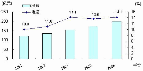 2002-2006年社會(huì)消費(fèi)品零售總額及增長(zhǎng)速度