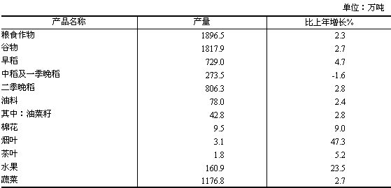 農(nóng)業(yè)生產(chǎn)形勢(shì)良好。全年糧食種植面積3547.1千公頃,比上年增長(zhǎng)0.8%,其中稻谷播種面積3239.3千公頃,增長(zhǎng)1.6%。油料種植面積585.8千公頃,增長(zhǎng)1.5%。棉花種植面積65.7千公頃,增長(zhǎng)2.8%。蔬菜種植面積555.5千公頃,增長(zhǎng)2.2%。糧食總產(chǎn)量1896.5萬(wàn)噸,增產(chǎn)42.6萬(wàn)噸,總產(chǎn)量連續(xù)三年創(chuàng)歷史新高。肉類總產(chǎn)量250.1萬(wàn)噸,增長(zhǎng)2.2%,其中,牛肉增長(zhǎng)15.3%,羊肉增長(zhǎng)6.8%,豬肉增長(zhǎng)1.7%。全年完成造林64千公頃,增長(zhǎng)34.5%,森林覆蓋率達(dá)到60.05%,位居全國(guó)第二位。水產(chǎn)品產(chǎn)量179.9萬(wàn)噸,增長(zhǎng)6.7%。