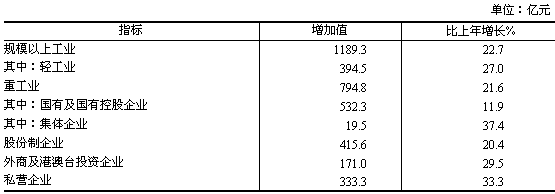 工業(yè)生產(chǎn)快速增長(zhǎng)。全年全部工業(yè)增加值1806.2億元,比上年增長(zhǎng)19.0%。其中,規(guī)模以上工業(yè)增加值達(dá)到1189.3億元,增長(zhǎng)22.7%,連續(xù)四年保持20%以上增長(zhǎng)。支柱產(chǎn)業(yè)支撐作用加強(qiáng)。六大支柱產(chǎn)業(yè)完成工業(yè)增加值703.5億元,增長(zhǎng)27.9%,對(duì)規(guī)模以上工業(yè)增長(zhǎng)的貢獻(xiàn)率為59.4%,拉動(dòng)規(guī)模以上工業(yè)增長(zhǎng)13.5個(gè)百分點(diǎn)。