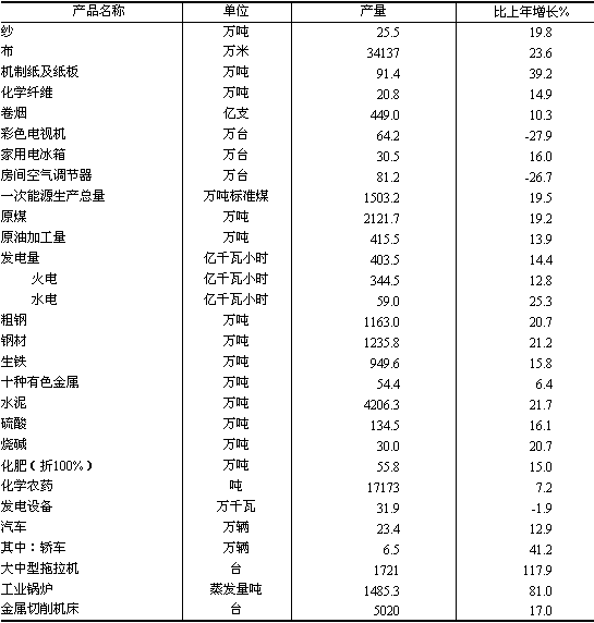 主要工業(yè)產(chǎn)品產(chǎn)量較快發(fā)展。全年規(guī)模以上工業(yè)企業(yè)一次能源生產(chǎn)總量1503.2萬(wàn)噸標(biāo)準(zhǔn)煤,比上年增長(zhǎng)19.5%;發(fā)電量403.5億千瓦小時(shí),增長(zhǎng)14.4%;原煤2122萬(wàn)噸,增長(zhǎng)19.2%;鋼材1236萬(wàn)噸,增長(zhǎng)21.2%;水泥4206萬(wàn)噸,增長(zhǎng)21.7%;服裝5.3億件,增長(zhǎng)20.8%;機(jī)制紙及紙板91.4萬(wàn)噸,增長(zhǎng)39.2%;家用電冰箱30.5萬(wàn)臺(tái),增長(zhǎng)16.0%;汽車23.4萬(wàn)輛,增長(zhǎng)12.9%;十種有色金屬54.4萬(wàn)噸,增長(zhǎng)6.4%。