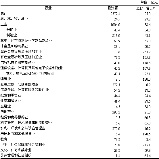 固定資產(chǎn)投資總量進(jìn)一步擴(kuò)大。全年全社會(huì)固定資產(chǎn)投資2683.2億元,比上年增長(zhǎng)23.7%。其中,城鎮(zhèn)固定資產(chǎn)投資2377.4億元,增長(zhǎng)25.0%。在城鎮(zhèn)投資中,第一產(chǎn)業(yè)投資24.5億元,增長(zhǎng)27.2%;第二產(chǎn)業(yè)投資1012.1億元,增長(zhǎng)38.8%,其中工業(yè)投資突破1000億元,達(dá)1004.0億元,增長(zhǎng)38.4%;第三產(chǎn)業(yè)投資1340.8億元,增長(zhǎng)16.2%;非國(guó)有投資1374.5億元,增長(zhǎng)32.1%,占城鎮(zhèn)投資的比重由上年的54.7%提高到57.8%;高新技術(shù)產(chǎn)業(yè)投資快速增長(zhǎng),完成投資121.4億元,增長(zhǎng)66.7%。