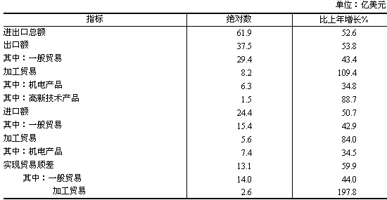 對(duì)外貿(mào)易成果豐碩。全省海關(guān)進(jìn)出口總額61.9億美元,比上年增長(zhǎng)52.6%。其中,出口37.5億美元,增長(zhǎng)53.8%;進(jìn)口24.4億美元,增長(zhǎng)50.7%;出口大于進(jìn)口13.1億美元,增長(zhǎng)59.9%。在出口中,外商投資企業(yè)完成出口12.2億美元,增長(zhǎng)90.0%;民營(yíng)企業(yè)11.6億美元,增長(zhǎng)45.6%;國(guó)有企業(yè)13.7億美元,增長(zhǎng)37.1%。 出口質(zhì)量明顯提高。在出口中,機(jī)電產(chǎn)品完成出口6.3億美元,增長(zhǎng)34.8%;高新技術(shù)產(chǎn)品出口1.5億美元,增長(zhǎng)88.7%。鎢及其化合物1.6億美元,增長(zhǎng)88.3%;未鍛造的銅及銅材1.7億美元,增長(zhǎng)12.8倍;服裝及衣著附件7.2億美元,增長(zhǎng)33.3%;紡織紗線、織物及制品2.5億美元,增長(zhǎng)32.6%。 出口對(duì)象日益多元化。在出口中,對(duì)臺(tái)灣地區(qū)出口1.6億美元,增長(zhǎng)3.3倍;對(duì)韓國(guó)出口1.7億美元,增長(zhǎng)1.3倍;對(duì)印度出口0.7億美元,增長(zhǎng)1.1倍;對(duì)新加坡出口0.9億美元,增長(zhǎng)69.9%;對(duì)美國(guó)出口5.5億美元,增長(zhǎng)45.5%;對(duì)日本出口3.7億美元,增長(zhǎng)30.0%。