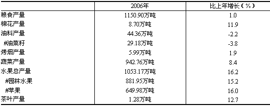 2006年,全省農(nóng)業(yè)再獲豐收,糧食播種面積穩(wěn)定,產(chǎn)量增加,果業(yè)持續(xù)快速發(fā)展,水果總產(chǎn)再創(chuàng)新高,畜牧業(yè)穩(wěn)定發(fā)展,產(chǎn)業(yè)化步伐加快。全省糧食播種面積5179萬(wàn)畝,與上年基本持平。
