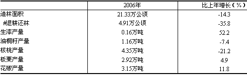 林業(yè)生產(chǎn)實(shí)現(xiàn)生態(tài)建設(shè)和經(jīng)濟(jì)效益協(xié)調(diào)發(fā)展。2006年,全省林業(yè)生產(chǎn)從過(guò)去的以退耕還林、增加造林面積、封山綠化為主,向提高林木質(zhì)量、保護(hù)森林資源、改善生態(tài)環(huán)境、增加林業(yè)產(chǎn)品產(chǎn)出方向轉(zhuǎn)變。主要林產(chǎn)品產(chǎn)量穩(wěn)定增長(zhǎng)。