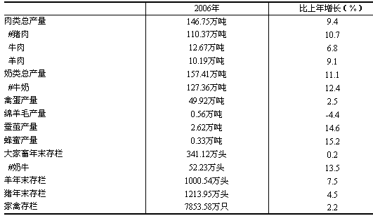 畜牧業(yè)生產(chǎn)穩(wěn)定發(fā)展,產(chǎn)業(yè)化步伐加快。2006年,我省繼續(xù)堅(jiān)持把畜牧業(yè)作為農(nóng)業(yè)結(jié)構(gòu)調(diào)整的主導(dǎo)產(chǎn)業(yè),以市場(chǎng)為導(dǎo)向,以產(chǎn)業(yè)化發(fā)展為目標(biāo),以奶業(yè)發(fā)展為突破口,狠抓疫病防治、健全良種建設(shè)、推廣標(biāo)準(zhǔn)化飼養(yǎng)、大力實(shí)施科技興牧戰(zhàn)略,促進(jìn)了畜牧業(yè)生產(chǎn)方式的轉(zhuǎn)變和畜產(chǎn)品生產(chǎn)能力的提高。