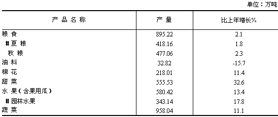 全年農(nóng)林牧漁業(yè)總產(chǎn)值883.54億元,比上年增長(zhǎng)7.5%。其中,農(nóng)業(yè)產(chǎn)值638.60億元,增長(zhǎng)7.7%;林業(yè)產(chǎn)值17.20億元,增長(zhǎng)6.5%;畜牧業(yè)產(chǎn)值189.07億元,增長(zhǎng)7.8%;漁業(yè)產(chǎn)值4.69億元,增長(zhǎng)5.3%;農(nóng)林牧漁服務(wù)業(yè)產(chǎn)值33.98億元,增長(zhǎng)4.9%。 全年農(nóng)作物種植面積382.83萬(wàn)公頃(5742.50萬(wàn)畝)。其中,糧食種植面積146.58萬(wàn)公頃(2198.63萬(wàn)畝),下降0.4%;棉花種植面積128.66萬(wàn)公頃(1929.83萬(wàn)畝),增長(zhǎng)11.1%;油料種植面積15.17萬(wàn)公頃(227.60萬(wàn)畝),下降18.2%;糖料種植面積9.44萬(wàn)公頃(141.60萬(wàn)畝),增長(zhǎng)35.1%;蔬菜種植面積18.68萬(wàn)公頃(280.23萬(wàn)畝),增長(zhǎng)5.8%;瓜果類(lèi)種植面積7.40萬(wàn)公頃(111.03萬(wàn)畝),增長(zhǎng)4.9%。 全年糧食產(chǎn)量895.22萬(wàn)噸,比上年增長(zhǎng)2.1%;棉花產(chǎn)量218.01萬(wàn)噸,增長(zhǎng)11.4%;油料產(chǎn)量32.82萬(wàn)噸,下降15.7%;甜菜產(chǎn)量555.53萬(wàn)噸,增長(zhǎng)32.6%。