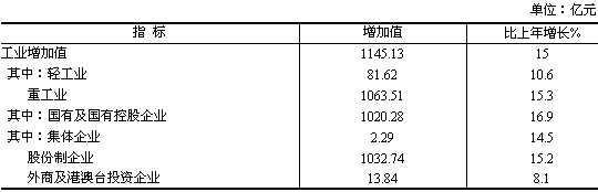 全年工業(yè)增加值1218.73億元,比上年增長(zhǎng)15.2 %。其中,規(guī)模以上工業(yè)增加值1145.13億元,增長(zhǎng)15.0%。