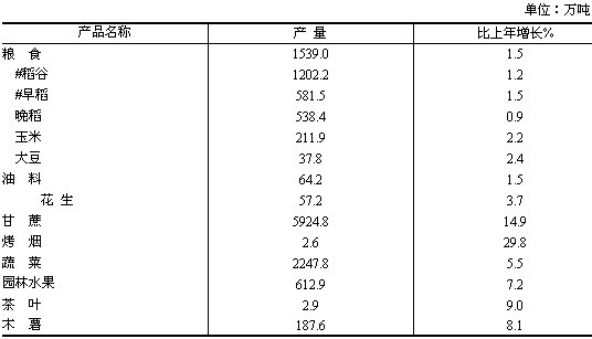 全年糧食種植面積3326.3千公頃,比上年減少24.6千公頃;油料種植面積311.9千公頃,減少2.2千公頃;甘蔗種植面積838.4千公頃,增加90.8千公頃;蔬菜種植面積1131.8千公頃,增加37.4千公頃;桑園面積111.2千公頃,增加27.5千公頃;烤煙種植面積15.9千公頃,增加2.0千公頃。 全年糧食產(chǎn)量1539.0萬噸,比上年增加22.7萬噸,增產(chǎn)1.5%;油料產(chǎn)量64.2萬噸,增產(chǎn)1.5%;甘蔗產(chǎn)量5924.8萬噸,增產(chǎn)14.9%;蔬菜產(chǎn)量(含菌類)2247.8萬噸,增產(chǎn)5.5