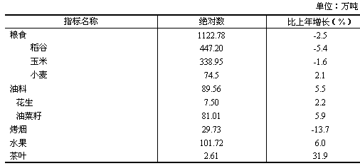 農(nóng)業(yè)生產(chǎn)形勢基本穩(wěn)定。2006年,全省種植業(yè)實(shí)現(xiàn)增加值228.41億元,比上年增長1.3%。糧食種植面積達(dá)到310.85萬公頃(4662.75萬畝),比上年增長1.1%?緹煼N植面積17.8萬公頃(267萬畝),因計(jì)劃調(diào)減比上年下降13.8%;油料種植面積56.38萬公頃(845.7萬畝),比上年增長1.6%;蔬菜種植面積49.45萬公頃(741.75萬畝),比上年增長4.5%。年末果園面積119143公頃(178.71萬畝),比上年增長0.2%;年末茶園面積63596公頃(95.39萬畝),比上年增長6.5%。受部分地區(qū)嚴(yán)重干旱影響,糧食總產(chǎn)量1122.78萬噸,比上年下降2.5%;油料作物產(chǎn)量89.56萬噸,比上年增長5.5%,創(chuàng)我省油料作物產(chǎn)量歷史新高?緹煯a(chǎn)量29.73萬噸,比上年下降13.7%。