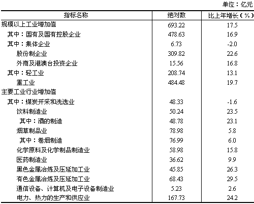 2006年,主要生產(chǎn)要素供求緊張狀況明顯改善,工業(yè)在優(yōu)勢產(chǎn)業(yè)帶動(dòng)下實(shí)現(xiàn)快速發(fā)展。全省工業(yè)增加值完成857.17億元,比上年增長15.0%。其中,全部國有及年產(chǎn)品銷售收入在500萬元及以上非國有工業(yè)企業(yè)(以下簡稱規(guī)模以上工業(yè)企業(yè))實(shí)現(xiàn)增加值693.22億元,比上年增長17.5%。