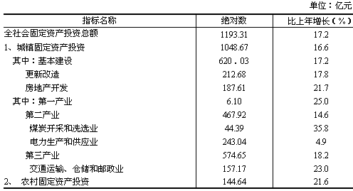 固定資產(chǎn)投資合理穩(wěn)定增長,一批重點(diǎn)項(xiàng)目建成投產(chǎn)。2006年,全省全社會(huì)固定資產(chǎn)投資總額完成1193.31億元,比上年增長17.2%,凈增加175.06億元。