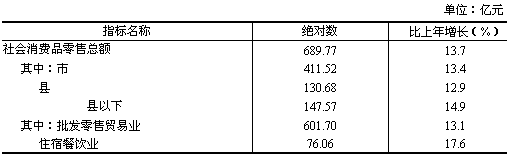 消費(fèi)品市場繼續(xù)保持穩(wěn)步發(fā)展的良好態(tài)勢。全省實(shí)現(xiàn)社會(huì)消費(fèi)品零售總額689.77億元,比上年增長13.7%。城鄉(xiāng)消費(fèi)品市場實(shí)現(xiàn)較快增長,其中,城市(市、縣)消費(fèi)品零售總額增長13.3%,農(nóng)村(縣以下)消費(fèi)品零售總額增長14.9%。住宿餐飲業(yè)增長17.6%,其中星級(jí)住宿業(yè)和限額以上餐飲業(yè)增長19.1%。