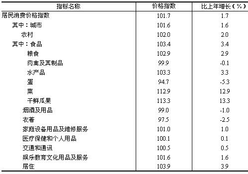 居民消費(fèi)價(jià)格指數(shù)溫和上漲。2006年,受食品、居住、娛樂教育文化用品及服務(wù)、家庭設(shè)備用品及維修服務(wù)等價(jià)格上漲的影響,全省居民消費(fèi)價(jià)格總水平比上年上漲1.7%,漲幅比上年提高0.7個(gè)百分點(diǎn)。