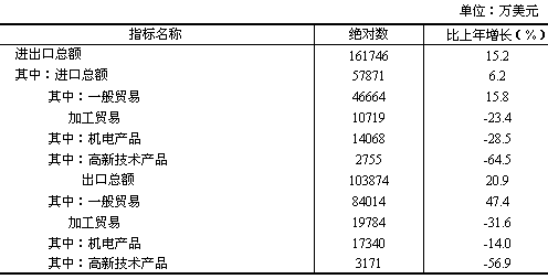對(duì)外貿(mào)易實(shí)現(xiàn)恢復(fù)性增長。全年完成進(jìn)出口總額16.17億美元,比上年增長15.2%。其中,進(jìn)口總額5.79億美元,比上年增長6.2%;出口總額10.39億美元,比上年增長20.9%。