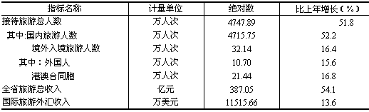 全年新批外商投資企業(yè)56個(gè),實(shí)際利用外商直接投資9384萬美元,比上年下降12.9%。 旅游業(yè)增長速度加快。2006年,全省接待旅游總?cè)藬?shù)4747.89萬人次,比上年增長51.8%,其中,國內(nèi)旅游人數(shù)4715.75萬人次,增長52.2%;實(shí)現(xiàn)旅游總收入387.05億元,增長54.1%。