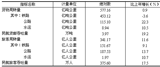 交通運(yùn)輸能力繼續(xù)提高。鐵路、公路、水運(yùn)完成貨物周轉(zhuǎn)量577.16億噸公里,比上年增長0.9%,完成旅客周轉(zhuǎn)量341.17億人公里,比上年增長11.6%;民航完成貨郵吞吐量3.97萬噸,比上年增長19.2%,完成旅客吞吐量375.60萬人,比上年增長17.5%。