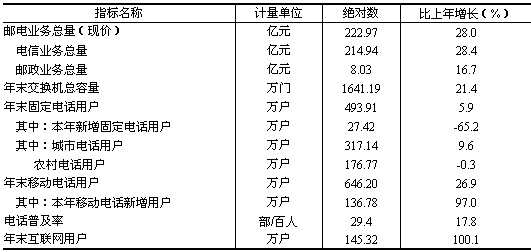 全年郵電業(yè)務(wù)總量222.97億元,比上年增長28.0%。其中,電信業(yè)務(wù)總量214.94億元,比上年增長28.4%;郵政業(yè)務(wù)總量8.03億元,比上年增長16.7%。年末移動(dòng)電話用戶、互聯(lián)網(wǎng)用戶分別比上年增長26.9%和100.1%。