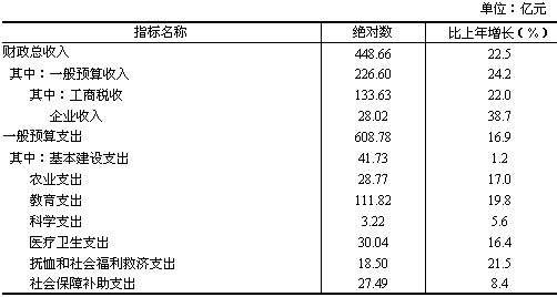 財(cái)政收支增長較快。2006年,全省完成財(cái)政總收入448.66億元,比上年增長22.5%。其中,一般預(yù)算收入226.60億元,比上年增長24.2%;一般預(yù)算支出608.78億元,比上年增長16.9%,其中,撫恤和社會(huì)福利救濟(jì)、教育、醫(yī)療衛(wèi)生和農(nóng)業(yè)等方面的支出增長幅度較大。