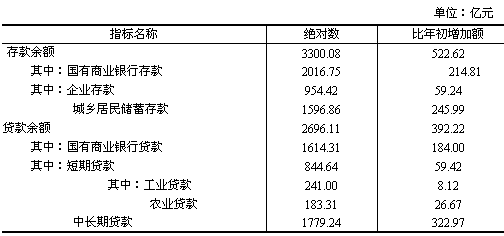 注:一般預(yù)算收入即為地方財(cái)政收入,一般預(yù)算支出即為地方財(cái)政支出。 金融業(yè)穩(wěn)健發(fā)展。2006年末,全省金融機(jī)構(gòu)人民幣各項(xiàng)存款余額為3300.08億元,比年初增加522.62億元;人民幣各項(xiàng)貸款余額為2696.11億元,比年初增加392.22億元。