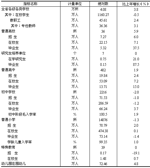 “兩基”攻堅(jiān)達(dá)標(biāo)驗(yàn)收,并獲教育部批準(zhǔn),全省“兩基”人口覆蓋率達(dá)到100%。農(nóng)村義務(wù)教育經(jīng)費(fèi)保障機(jī)制得到建立和完善,全年免除631萬學(xué)生學(xué)雜費(fèi)資金5.33億元,免費(fèi)提供193.23萬中小學(xué)生教科書資金共計(jì)1.7億元;建成農(nóng)村寄宿制初中100所,補(bǔ)助62萬名初中寄宿貧困生資金共計(jì)6200萬元。高等教育經(jīng)過結(jié)構(gòu)調(diào)整、資源整合和體制改革,教育規(guī)模繼續(xù)擴(kuò)大。