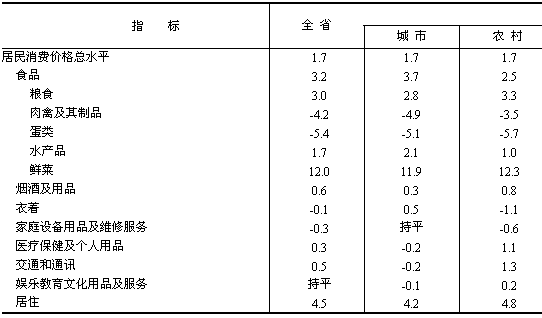 國(guó)民經(jīng)濟(jì)平穩(wěn)較快增長(zhǎng)。初步核算,全省生產(chǎn)總值達(dá)到11613.7億元,比上年增長(zhǎng)13.2%。其中,第一產(chǎn)業(yè)增加值1605.4億元,增長(zhǎng)5.0%;第二產(chǎn)業(yè)增加值6071.3億元,增長(zhǎng)15.0%;第三產(chǎn)業(yè)增加值3937億元,增長(zhǎng)13.9%。三次產(chǎn)業(yè)結(jié)構(gòu)由上年的14.9:51.8:33.3調(diào)整為13.8:52.3:33.9。人均生產(chǎn)總值16894元,比上年增長(zhǎng)12.4%。 物價(jià)總體保持平穩(wěn)。居民消費(fèi)價(jià)格總水平比上年上漲1.7%,其中城市和農(nóng)村均上漲1.7%。價(jià)格變動(dòng)結(jié)構(gòu)性特征明顯。食品類和居住類價(jià)格上漲幅度較大,漲幅分別為3.2%和4.5%,是拉動(dòng)居民消費(fèi)價(jià)格上漲的主要因素。工業(yè)品出廠價(jià)格上漲0.8%,原材料、燃料、動(dòng)力購(gòu)進(jìn)價(jià)格上漲5.0%,漲幅比上年分別回落3.6和2.0個(gè)百分點(diǎn)。農(nóng)產(chǎn)品生產(chǎn)價(jià)格上漲0.2%。