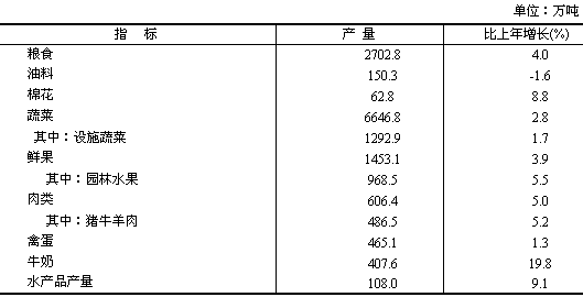 農(nóng)業(yè)生產(chǎn)形勢(shì)良好。糧食生產(chǎn)再獲豐收,全年糧食播種面積619.9萬公頃,比上年減少0.7%;糧食單產(chǎn)290.7公斤,創(chuàng)歷史新高;總產(chǎn)量2702.8萬噸,增長(zhǎng)4.0%,是2000年以來最高水平。棉花生產(chǎn)出現(xiàn)較大轉(zhuǎn)機(jī),播種面積62.3萬公頃,比上年增長(zhǎng)8.7%;總產(chǎn)量62.8萬噸,由2005年下降轉(zhuǎn)為增長(zhǎng)8.8%。油料播種面積53.8萬公頃,減少3.8%;總產(chǎn)量150.3萬噸,下降1.6%。蔬菜播種面積112.3萬公頃,增長(zhǎng)1.6%;總產(chǎn)量6646.8萬噸,增長(zhǎng)2.8%。畜牧業(yè)生產(chǎn)保持平穩(wěn),肉類、禽蛋、牛奶產(chǎn)量分別達(dá)到606.4萬噸、465.1萬噸和407.6萬噸,分別增長(zhǎng)5.0%、1.3%和19.8%。漁業(yè)生產(chǎn)發(fā)展較快,全年水產(chǎn)品產(chǎn)量達(dá)108.0萬噸,增長(zhǎng)9.1%。