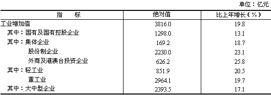 工業(yè)生產(chǎn)較快增長(zhǎng)。全部工業(yè)增加值完成5453.4億元,增長(zhǎng)16.0%。其中規(guī)模以上工業(yè)增加值3816.0億元,增長(zhǎng)19.8%。產(chǎn)銷銜接良好,產(chǎn)銷率為98.2%,比上年提高0.4個(gè)百分點(diǎn)。