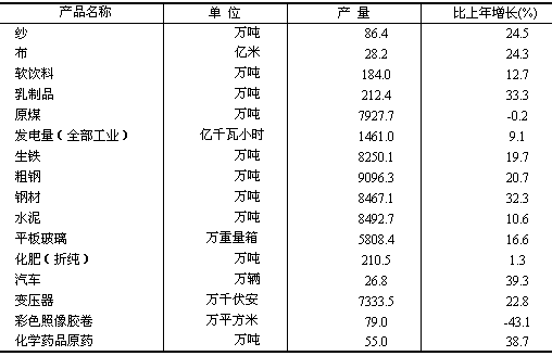 經(jīng)濟(jì)效益穩(wěn)步提高。全省規(guī)模以上工業(yè)實(shí)現(xiàn)利潤(rùn)888.1億元,比上年增長(zhǎng)30.4%。其中,國(guó)有及國(guó)有控股工業(yè)實(shí)現(xiàn)利潤(rùn)253.0億元,增長(zhǎng)16.6%;股份制企業(yè)實(shí)現(xiàn)利潤(rùn)500.7億元,增長(zhǎng)30.6%;外商及港澳臺(tái)投資企業(yè)實(shí)現(xiàn)利潤(rùn)205.0億元,增長(zhǎng)31.3%;私營(yíng)企業(yè)實(shí)現(xiàn)利潤(rùn)248.7億元,增長(zhǎng)33.1%。多數(shù)行業(yè)盈利水平提高。在38個(gè)工業(yè)行業(yè)大類中,有33個(gè)行業(yè)利潤(rùn)增長(zhǎng)。其中黑色金屬冶煉及壓延加工業(yè)實(shí)現(xiàn)利潤(rùn)254.8億元,石油和天然氣開采業(yè)實(shí)現(xiàn)利潤(rùn)134.9億元,電力、蒸汽、熱水的生產(chǎn)和供應(yīng)業(yè)實(shí)現(xiàn)利潤(rùn)70.3億元。 工業(yè)結(jié)構(gòu)進(jìn)一步調(diào)整優(yōu)化。積極運(yùn)用高新技術(shù)和先進(jìn)適用技術(shù)改造提升傳統(tǒng)產(chǎn)業(yè),主導(dǎo)產(chǎn)業(yè)得到強(qiáng)化,對(duì)工業(yè)生產(chǎn)的支撐作用強(qiáng)勁。鋼鐵、裝備制造、紡織服裝、建材建筑、食品、石油化工、醫(yī)藥等七大主導(dǎo)產(chǎn)業(yè)完成增加值3070.0億元,比上年增長(zhǎng)21.6%;占規(guī)模以上工業(yè)增加值的80.5%,比上年提高2.1個(gè)百分點(diǎn),對(duì)工業(yè)生產(chǎn)增長(zhǎng)的貢獻(xiàn)率達(dá)87.1%。產(chǎn)品結(jié)構(gòu)調(diào)整優(yōu)化,鋼材板帶比達(dá)53.9%,比上年提高6.4個(gè)百分點(diǎn);原材料、能源等優(yōu)勢(shì)產(chǎn)品增長(zhǎng)較快,鋼材產(chǎn)量增長(zhǎng)32.3%,平板玻璃增長(zhǎng)16.6%;一批高附加值產(chǎn)品呈現(xiàn)快速增長(zhǎng),汽車產(chǎn)量增長(zhǎng)39.3%,自動(dòng)化儀表及系統(tǒng)增長(zhǎng)23.7%,光通信設(shè)備增長(zhǎng)1.3倍,復(fù)印機(jī)械增長(zhǎng)45.3%。高新技術(shù)產(chǎn)業(yè)保持較快增長(zhǎng),實(shí)現(xiàn)增加值288.5億元,增長(zhǎng)21.2%。