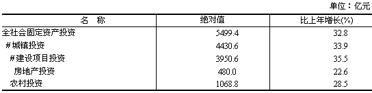 固定資產(chǎn)投資平穩(wěn)較快增長(zhǎng)。全社會(huì)固定資產(chǎn)投資完成5499.4億元,比上年增長(zhǎng)32.8%。其中,城鎮(zhèn)固定資產(chǎn)投資4430.6億元,增長(zhǎng)33.9%,增速比上年回落2.6個(gè)百分點(diǎn);農(nóng)村投資1068.8億元,增長(zhǎng)28.5%。