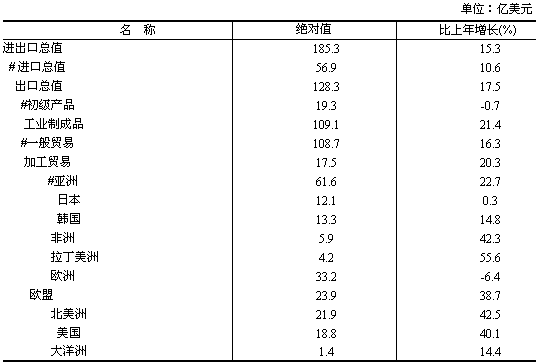 對(duì)外貿(mào)易較快增長(zhǎng)。進(jìn)出口總值完成185.3億美元,比上年增長(zhǎng)15.3%。其中出口總值128.3億美元,增長(zhǎng)17.5%,增速比上年加快0.5個(gè)百分點(diǎn)。出口商品結(jié)構(gòu)進(jìn)一步優(yōu)化。工業(yè)制成品出口109.1億美元,增長(zhǎng)21.4%,占出口總值的比重達(dá)85%,比上年提高2.7個(gè)百分點(diǎn);機(jī)電產(chǎn)品和高技術(shù)產(chǎn)品出口分別增長(zhǎng)51.5%和1.1倍。初級(jí)產(chǎn)品出口得到抑制,出口額19.3億美元,下降0.7%。積極推進(jìn)出口市場(chǎng)多元化戰(zhàn)略,對(duì)世界主要貿(mào)易伙伴的貿(mào)易額均有不同程度的增長(zhǎng)。