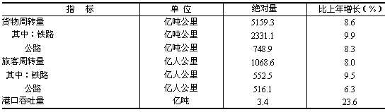 交通郵電業(yè)進(jìn)一步發(fā)展。全年交通運(yùn)輸、倉(cāng)儲(chǔ)和郵政業(yè)實(shí)現(xiàn)增加值861.1億元,比上年增長(zhǎng)10.9%。 交通運(yùn)輸業(yè)快速發(fā)展。全年貨物周轉(zhuǎn)量5159.3億噸公里,比上年增長(zhǎng)8.6%;旅客周轉(zhuǎn)量1068.6億人公里,增長(zhǎng)8.0%。港口吞吐量突破3億噸,達(dá)3.4億噸,增長(zhǎng)23.6%。全省公路通車?yán)锍?43778公里(包括村路),其中高速公路2329公里,新建成高速公路194公里。新、改建農(nóng)村公路12953公里,總里程達(dá)125590公里。