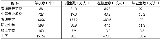 各級(jí)各類教育平穩(wěn)發(fā)展。研究生招生7712人,增長(zhǎng)16.9%,在學(xué)研究生20088人,增長(zhǎng)27.3%。普通高等學(xué)校88所,招生31.0萬人,比上年增長(zhǎng)23.7%,在校學(xué)生86.3萬人,增長(zhǎng)11.5%。中等專業(yè)學(xué)校在校生43.3萬人,普通中學(xué)在校學(xué)生480.6萬人,職業(yè)中學(xué)在校生47.6萬人,小學(xué)在校學(xué)生470.3萬人。學(xué)齡兒童入學(xué)率達(dá)99.4%。九年義務(wù)教育完成率達(dá)89.9%,比上年提高1.1個(gè)百分點(diǎn)。幼兒園在園幼兒133.6萬人。