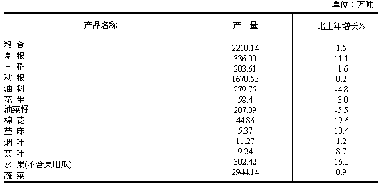 全年農(nóng)林牧漁業(yè)增加值按可比價計算比上年增長5.1%。糧食種植面積421.91萬公頃,比上年增加15.10萬公頃;棉花種植面積38.20萬公頃,增加2.11萬公頃;油料種植面積135.37萬公頃,減少10.65萬公頃。糧食總產(chǎn)量2210.14萬噸,比上年增產(chǎn)32.76萬噸,增長1.5%;棉花總產(chǎn)量44.86萬噸,增產(chǎn)7.36萬噸,增長19.6%;油料產(chǎn)量279.75萬噸,減產(chǎn)14.15萬噸,下降4.8%(主要農(nóng)產(chǎn)品產(chǎn)量見表1)。