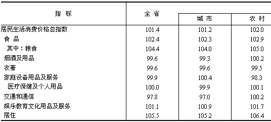 %。其中,科學和科技三項費用支出8.9億元,增長21.7%;農(nóng)業(yè)支出27.7億元,增長29.5%;教育支出91.3億元,增長23.1%;醫(yī)療衛(wèi)生支出26.9億元,增長30.0%;撫恤和社會福利救濟29.3億元,增長26.4%。 價格總體水平有所回落。全省居民消費價格指數(shù)為101.4