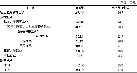 在通信、汽車、住房、旅游等新一輪消費結(jié)構(gòu)升級和假日經(jīng)濟效應(yīng)的帶動下,全省消費品市場十分繁榮活躍,消費需求持續(xù)較快增長。全年實現(xiàn)社會消費品零售額1675.84億元,比上年增長14.7