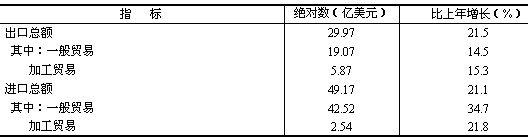 %。其中實現(xiàn)出口總值29.97億美元,增長21.5%;實現(xiàn)進口總值 49.17 億美元,增長21.1 %。在出口總值中,機電產(chǎn)品出口5.72億美元,增長20.2