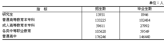 全年研究生教育招生1.4萬人,在學研究生4.1萬人,畢業(yè)生8946人。普通高等教育招生13.3萬人,在校生43.5萬人,畢業(yè)生10.2萬人。成人高等教育招生6.0萬人,在校生16.5萬人,畢業(yè)生2.8萬人。各類中等職業(yè)教育招生10.6萬人,在校生22.9萬人,畢業(yè)生6.0萬人。普通高中招生17.6萬人,在校生51.3萬人,畢業(yè)生14.6萬人。初中招生31.8萬人,在校生100.6萬人,畢業(yè)生38.8萬人。小學招生23.6萬人,在校生155.6萬人,畢業(yè)生31.2萬人。幼兒園在園幼兒32.5萬人。特殊教育招生428人,在校生4881人,畢業(yè)生611人。