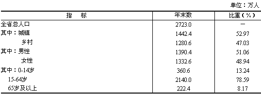 年末全省總?cè)丝跒?723萬人,比上年末增加7萬人。全年全省出生人口21萬人,出生率為7.67‰;死亡人口14萬人,死亡率為5.00‰;全年凈增人口7萬人,自然增長率為2.67‰。人口出生率、死亡率和自然增長率分別比2000年末降低1.86、0.38和1.48個千分點。