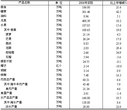 。ㄒ唬┙(jīng)濟總量 整體經(jīng)濟加速增長,綜合實力明顯增強。初步核算,并經(jīng)國家統(tǒng)計局聯(lián)審評估認定,2006年,全省生產(chǎn)總值(GDP)1052.43億元,按可比價格計算,比上年增長12.5%,增速提高2.3個百分點,自2003年走出“房地產(chǎn)泡沫”陰影進入兩位數(shù)增長平臺后,創(chuàng)1994年以來生產(chǎn)總值增速新高,提前一年實現(xiàn)生產(chǎn)總值跨千億目標;其中,第一產(chǎn)業(yè)增加值344.20億元,增長9.1%;第二產(chǎn)業(yè)增加值287.79億元,增長19.8%;第三產(chǎn)業(yè)增加值420.44億元,增長11.0%。按常住人口計算,人均生產(chǎn)總值12650元,以當年平均匯率折算約合1617美元,增長11.3%。 產(chǎn)業(yè)結(jié)構(gòu)進一步調(diào)整優(yōu)化,新型工業(yè)和現(xiàn)代服務(wù)業(yè)得到大力發(fā)展。2006年,在全省生產(chǎn)總值中,第一產(chǎn)業(yè)所占比重由上年的32.96%降至32.71%,對經(jīng)濟增長貢獻率為24.4%;第二產(chǎn)業(yè)所占比重由26.07%提高至27.35%,對經(jīng)濟增長貢獻率為38.8%,居三次產(chǎn)業(yè)貢獻率首位;第三產(chǎn)業(yè)所占比重由40.97%降至39.94%,對經(jīng)濟增長貢獻率為36.8%。從各產(chǎn)業(yè)內(nèi)部結(jié)構(gòu)看,第一產(chǎn)業(yè)中優(yōu)勢農(nóng)業(yè)加快發(fā)展,漁業(yè)、畜牧業(yè)、瓜菜、水果等四大優(yōu)勢農(nóng)業(yè)對農(nóng)業(yè)經(jīng)濟增長的貢獻率達80.8%。第二產(chǎn)業(yè)中高新技術(shù)工業(yè)比重明顯提高,石油加工、化肥、紙漿、汽車制造、制藥、旋窯水泥等新型工業(yè)創(chuàng)造產(chǎn)值對規(guī)模以上工業(yè)經(jīng)濟增長貢獻率達77.5%,經(jīng)濟增長的技術(shù)與知識含量顯著提高。第三產(chǎn)業(yè)中現(xiàn)代服務(wù)業(yè)發(fā)展喜人。旅游客源結(jié)構(gòu)發(fā)生新的變化,接待境外游客增幅較境內(nèi)游客增幅快38.0個百分點;房地產(chǎn)市場在宏觀調(diào)控中理性發(fā)展,銷售面積大于竣工面積;金融環(huán)境進一步改善,資產(chǎn)質(zhì)量明顯提高,金融機構(gòu)本外幣存貸總量同步增長;會展產(chǎn)業(yè)方興未艾,成功主辦或協(xié)辦博鰲亞洲論壇年會、兩岸農(nóng)業(yè)合作論壇、東亞海大會及部長會議、第一屆世界海南青年大會等國際性大型會議。 宏觀經(jīng)濟景氣上揚,經(jīng)濟運行質(zhì)量和效益提高。2006年,反映宏觀經(jīng)濟運行質(zhì)量的企業(yè)家信心指數(shù)為134.1,比上年提高9.6點,已連續(xù)四年處于較景氣區(qū)間上行;反映微觀主體運營狀況的企業(yè)景氣指數(shù)為131.7,提高5.2點,企業(yè)生產(chǎn)經(jīng)營狀況不斷趨好,預(yù)期生產(chǎn)信心明顯增強。全省全口徑財政收入179.88億元,比上年增長24.3%。其中,地方財政收入102.29億元,增長21.1%,提前一年實現(xiàn)地方財政收入突破百億元目標。在地方財政收入中,一般預(yù)算收入81.76億元,比上年增長19.8%;基金收入20.53億元,比上年增長26.7%。稅收收入總額139.21億元,比上年增長25.2%。按各項稅收分,企業(yè)所得稅比上年增長24.9%,增值稅增長11.1%,營業(yè)稅增長21.3%,個人所得稅增長11.1%,房產(chǎn)稅增長18.2%。上劃中央“兩稅”收入54.69億元,增長37.7%;上劃中央所得稅收入14.38億元,增長18.9%。列入統(tǒng)計監(jiān)測的420家規(guī)模以上工業(yè)企業(yè)經(jīng)濟效益綜合指數(shù)205.65%,比上年提高9.4個百分點,創(chuàng)1997年建立工業(yè)企業(yè)綜合效益指數(shù)統(tǒng)計制度以來新高;實現(xiàn)利潤總額41.50億元,增長21.9%。 。ǘ┺r(nóng)林牧漁業(yè) 農(nóng)業(yè)內(nèi)部結(jié)構(gòu)繼續(xù)調(diào)整優(yōu)化,農(nóng)業(yè)生產(chǎn)保持較快發(fā)展。加大支農(nóng)力度,扎實推進社會主義新農(nóng)村建設(shè),農(nóng)村和農(nóng)業(yè)經(jīng)濟加快發(fā)展。2006年,全省農(nóng)業(yè)增加值344.20億元,比上年增長9.1%,增速提高3.1個百分點。在農(nóng)業(yè)內(nèi)部,漁業(yè)、畜牧業(yè)、瓜菜、水果等優(yōu)勢農(nóng)業(yè)持續(xù)較快發(fā)展,所占比重明顯提高,成為農(nóng)業(yè)經(jīng)濟較快增長的主導(dǎo)力量。全年水產(chǎn)品產(chǎn)量166萬噸,同比增長10.7%;肉類總量68.31萬噸,同比增長6.6%;瓜菜產(chǎn)量400.39萬噸,增長10.2%;水果產(chǎn)量187.85萬噸,增長15.6%。漁業(yè)、畜牧業(yè)、瓜菜、水果四大優(yōu)勢產(chǎn)業(yè)對農(nóng)業(yè)經(jīng)濟增長的貢獻率達80.8%。農(nóng)業(yè)經(jīng)濟效益隨著產(chǎn)業(yè)結(jié)構(gòu)的調(diào)整和農(nóng)產(chǎn)品價格上漲得到顯著提高。