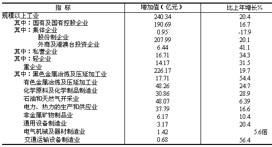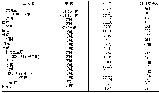 全省工業(yè)增加值265億元,按可比價(jià)格計(jì)算,比上年增長(zhǎng)18.7%。規(guī)模以上(全部國(guó)有工業(yè)及年產(chǎn)品銷(xiāo)售收入在500萬(wàn)元以上的非國(guó)有工業(yè)企業(yè))工業(yè)增加值240.34億元,增長(zhǎng)20.4%;新產(chǎn)品產(chǎn)值8.74億元,比上年增長(zhǎng)33.6%。 全年四大支柱產(chǎn)業(yè)創(chuàng)造增加值142.10億元,比上年增長(zhǎng)17.7%。其中,石油和天然氣開(kāi)采業(yè)46.81億元,增長(zhǎng)5.5%,水力發(fā)電業(yè)21.52億元,增長(zhǎng)23.8%,有色金屬業(yè)54.45億元,增長(zhǎng)22.0%,鹽化工業(yè)19.32億元,增長(zhǎng)31.6%。