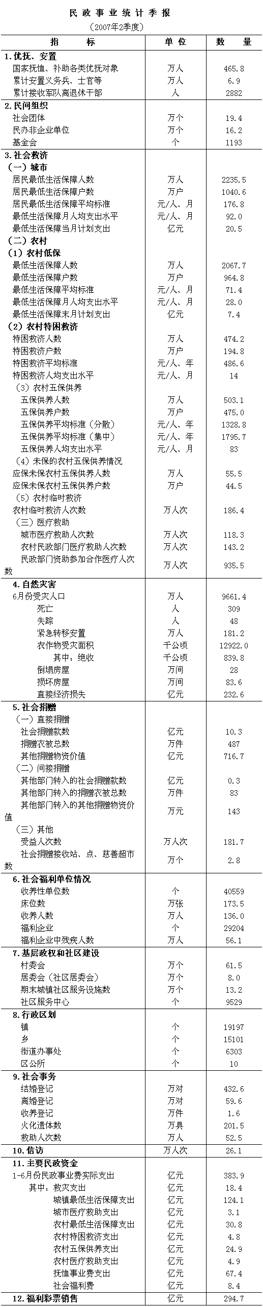 日前,民政部公布了2007年2季度民政事業(yè)統(tǒng)計數(shù)據(jù)。詳情如下: