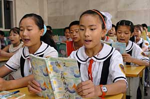 | 南京市河南村外來工子弟小學的學生在上語文課。南京6萬外來工子弟全部順利就學,并享受到與城里學生同等的待遇。本報記者 孫參