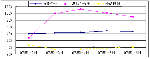 5、外商投資增長由負(fù)轉(zhuǎn)正,港澳臺企業(yè)投資高漲,私營企業(yè)投資保持活躍 隨著我國對高耗能、高污染投資項(xiàng)目的限制,企業(yè)所得稅內(nèi)外合一實(shí)施日期的臨近,再加上其他發(fā)展中國家如印度、越南等對引入外資的競爭,今年前5個月我國電子信息產(chǎn)業(yè)外資企業(yè)(港澳臺企業(yè)除外)的投資一直處于負(fù)增長狀態(tài),進(jìn)入6月份后,外資企業(yè)投資開始有所增長,累計(jì)完成投資371.2億元,同比增長1.3%。其中,移動通信及終端設(shè)備、計(jì)算機(jī)整機(jī)、集成電路、電子元件及組件幾個行業(yè)的外商投資仍處于負(fù)增長狀態(tài),移動通信及終端設(shè)備行業(yè)降幅高達(dá)54%。 港澳臺企業(yè)投資增速今年以來一直保持迅猛增長,1-6月累計(jì)完成投資279.1億元,同比增長89.7%,增幅比去年同期高78個百分點(diǎn)。港澳臺企業(yè)的投資主要集中在移動通信及終端設(shè)備、集成電路及光電子器件行業(yè)。 港澳臺企業(yè)與外商投資的不同發(fā)展趨勢,引起了我國電子信息產(chǎn)業(yè)投資結(jié)構(gòu)的變化。1-6月三資企業(yè)在我國大陸的總投資中,