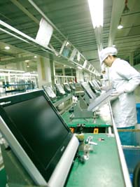 圖為員工在青島開發(fā)區(qū)海信工業(yè)園內(nèi)的液晶電視生產(chǎn)線上工作。新華社記者:馮杰 攝 |