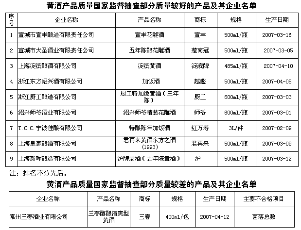 此次抽查依據(jù)GB2758-2005《發(fā)酵酒衛(wèi)生標準》等強制性國家標準及相應(yīng)產(chǎn)品的標準,對黃酒產(chǎn)品的感官、非糖固形物、酒精度、總酸、氨基酸態(tài)氮、苯甲酸、山梨酸、糖精鈉、甜蜜素、鉛、菌落總數(shù)、大腸菌群、沙門氏菌、志賀氏菌、金黃色葡萄球菌以及標簽等16個項目進行了檢驗。