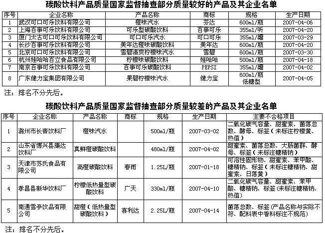 此次抽查依據(jù)GB/T10792-1995《碳酸飲料(汽水)》、GB2759.2-2003《碳酸飲料衛(wèi)生標(biāo)準(zhǔn)》、GB2760-1996《食品添加劑使用衛(wèi)生標(biāo)準(zhǔn)》、GB7718-2004《預(yù)包裝食品標(biāo)簽通則》等國(guó)家標(biāo)準(zhǔn)規(guī)定的要求,對(duì)碳酸飲料產(chǎn)品的感官、總酸、可溶性固形物、二氧化碳?xì)馊萘俊⒖Х纫、總砷、鉛、銅、苯甲酸、山梨酸、糖精鈉、甜蜜素、安賽蜜、胭脂紅、莧菜紅、檸檬黃、日落黃、亮藍(lán)、誘惑紅、菌落總數(shù)、大腸菌群、霉菌、酵母、沙門氏菌、志賀氏菌、金黃色葡萄球菌以及標(biāo)簽等27個(gè)項(xiàng)目進(jìn)行了檢驗(yàn)。
