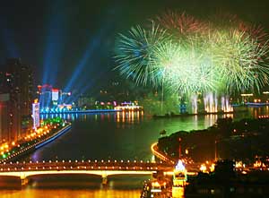2007年春節(jié),廣州珠江白鵝潭江面舉行煙花會演。攝影/本報記者